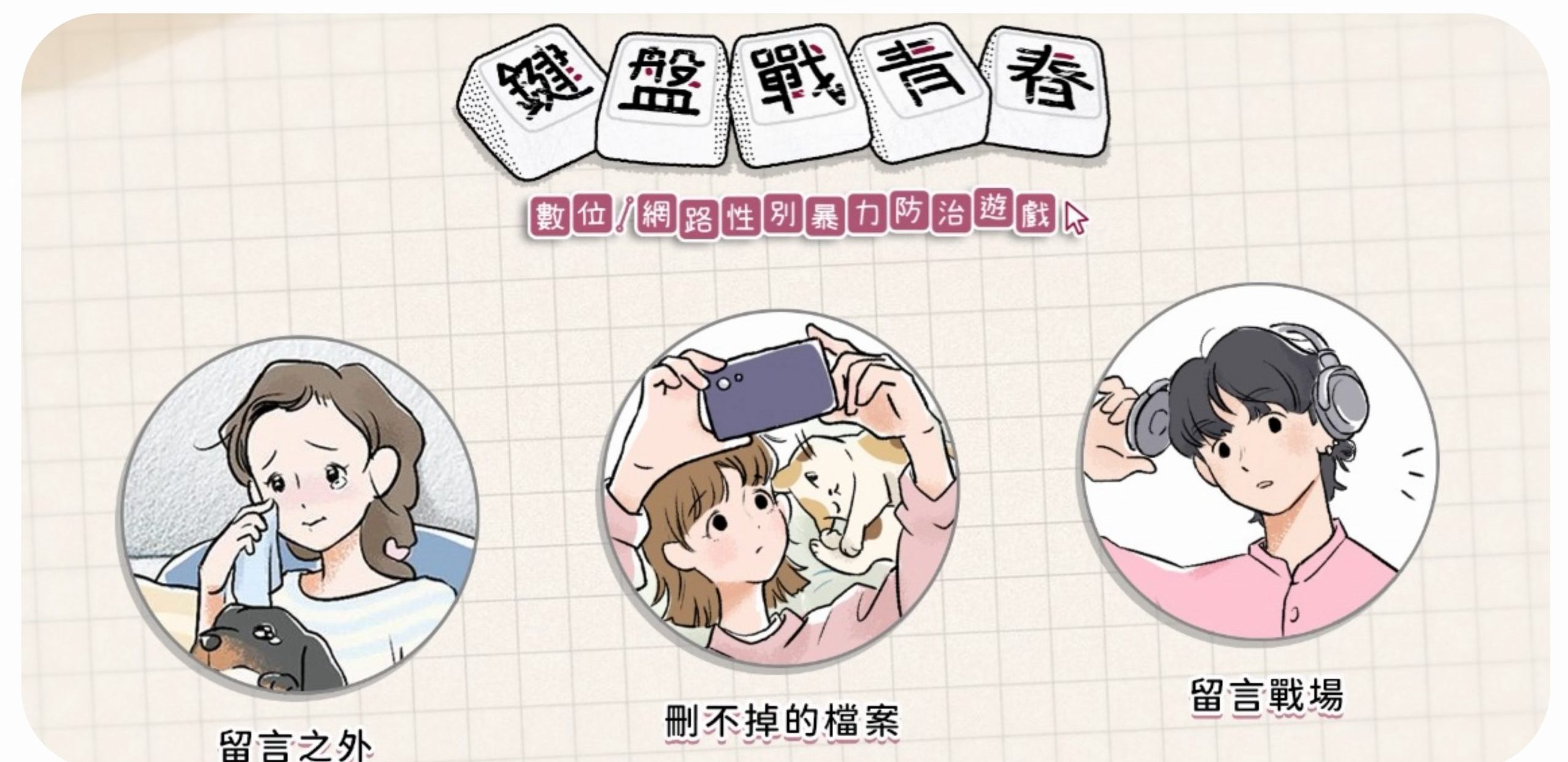 教育部全新打造之數位/網路性別暴力防治案例沉浸式互動遊戲:《鍵盤戰青春》,以4位大學生為主角,帶領玩家走入校園情境,認識常見的數位/網路性別暴力議題,包括「網路性騷擾」、「惡意或未經同意散布與性/性別有關個人私密資料」,以及近來逐漸攀升的「基於性別貶抑或仇恨之言論或行為」等。