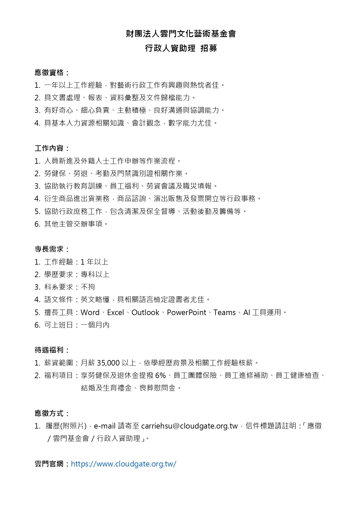 財團法人雲門文化藝術基金會【行政人資助理】招募